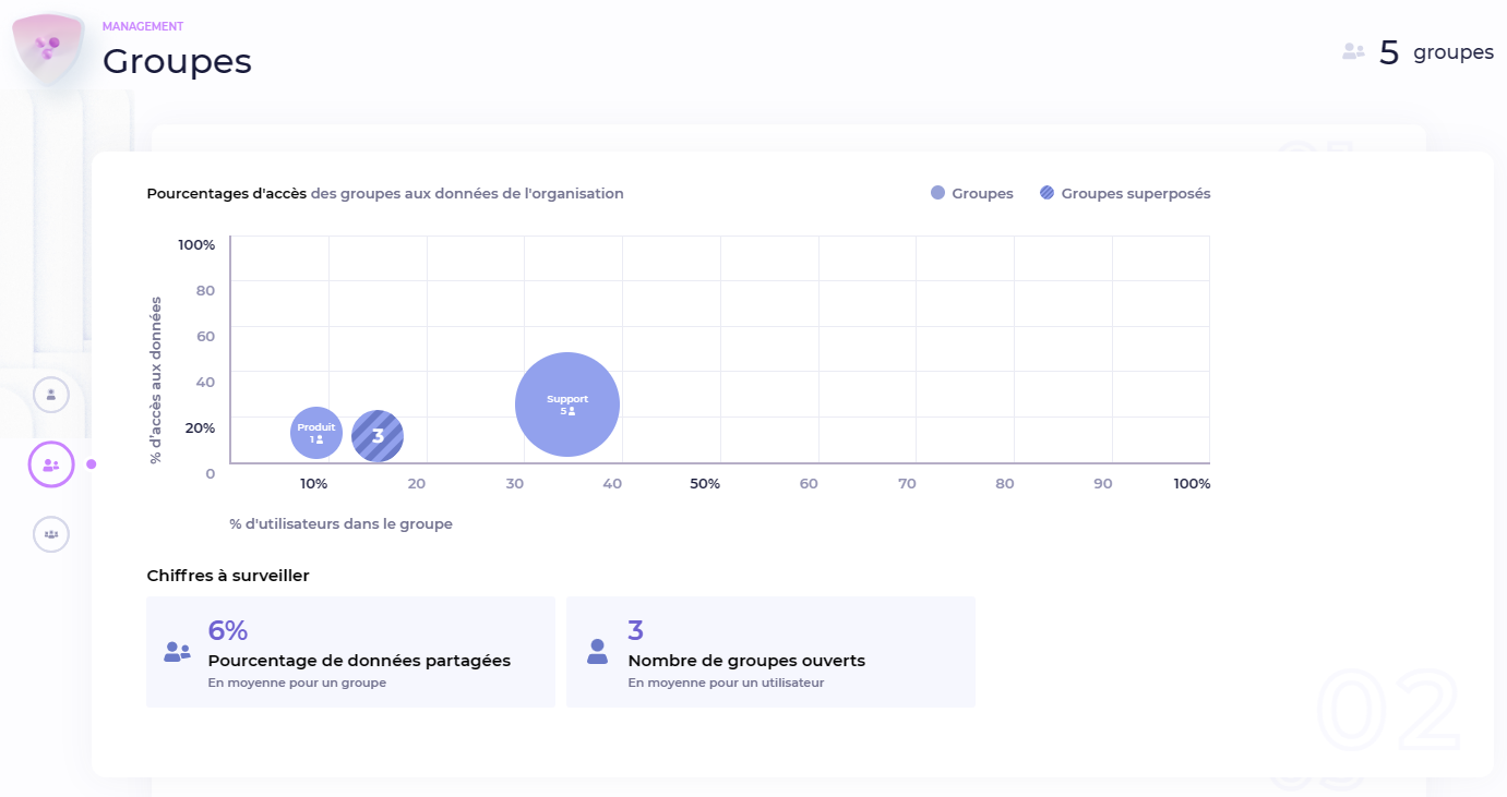 Cette section donne une vue sur les groupes de votre organisation : pour chaque groupe, vous pourrez comparer son volume (le pourcentage d'utilisateurs qu'il comprend) ainsi que son pourcentage d'accès aux données de l'organisation par rapport aux autres groupes de l'organisation.