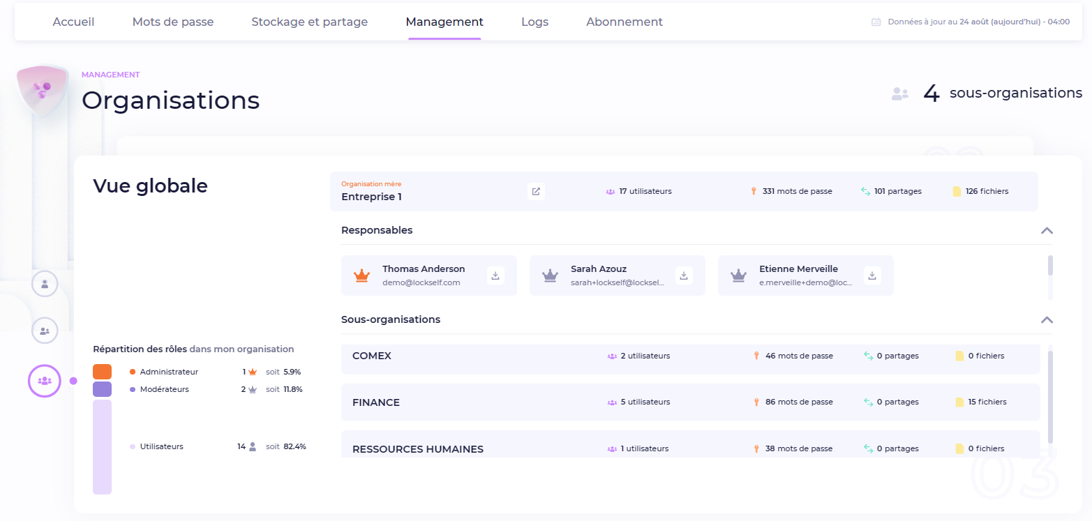 Cette section donne une vue globale sur l'organisation mère ainsi que les sous-organisations (tous sous-niveaux compris).