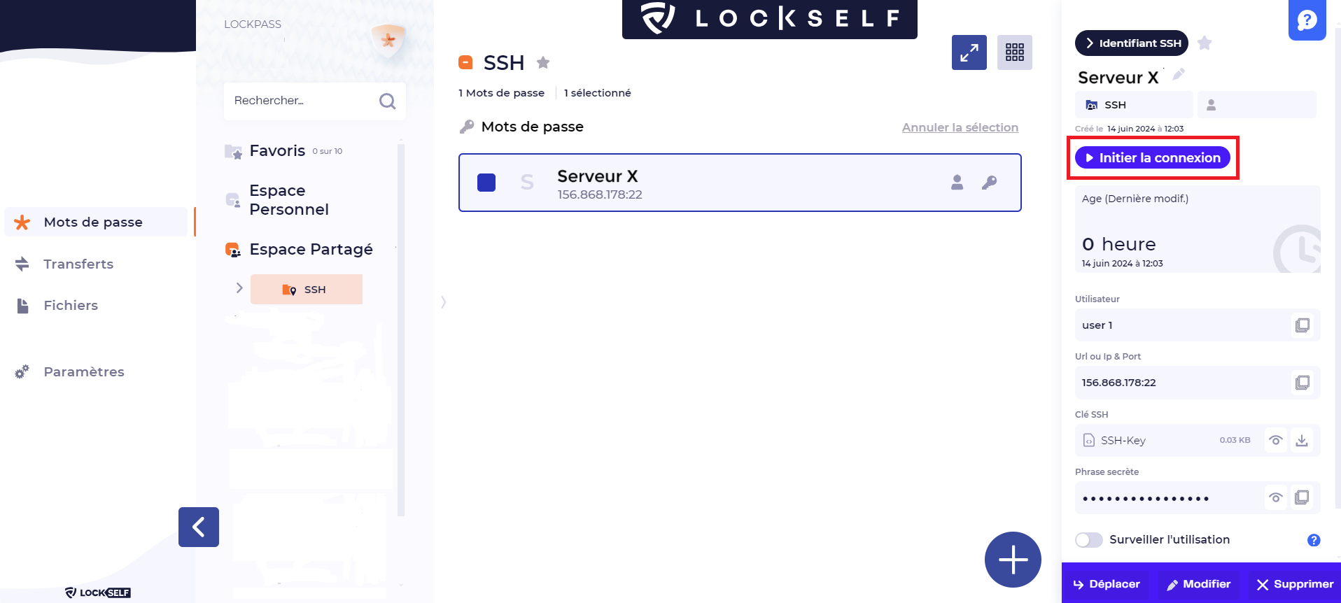 Pour utiliser une clé SSH, sélectionnez la clé souhaitée, et sur le volet de droite, cliquez sur « Initier la connexion »