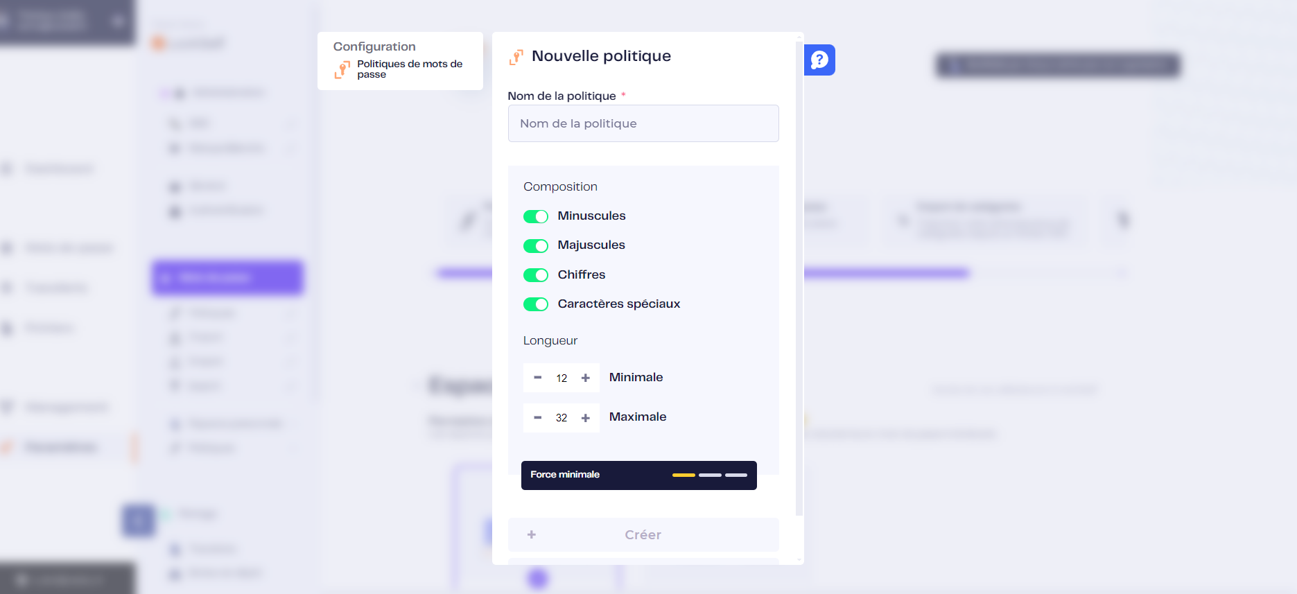 - Etape 3 : Donnez un nom à votre politique de mot de passe puis définissez ensuite les critères que vous souhaitez appliquer pour cette politique de mots de passe. Vous pouvez choisir le nombre minimal et maximal de caractères que les mots de passe devront contenir, ainsi que l'obligation ou non de contenir des caractères spéciaux, des majuscules, des minuscules ou des chiffres.