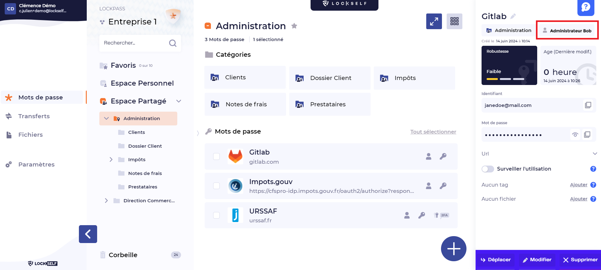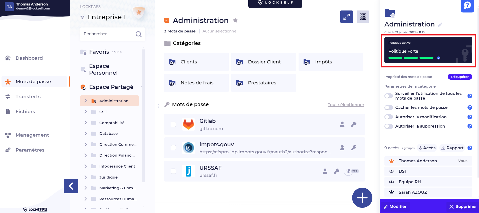 Ce droit standard ne permet pas la modification, le déplacement, ou la suppression des mots de passe dont ils ne sont pas les propriétaires (qu'ils n'ont pas ajoutés). Si besoin, consultez la présentation des droits utilisateurs.