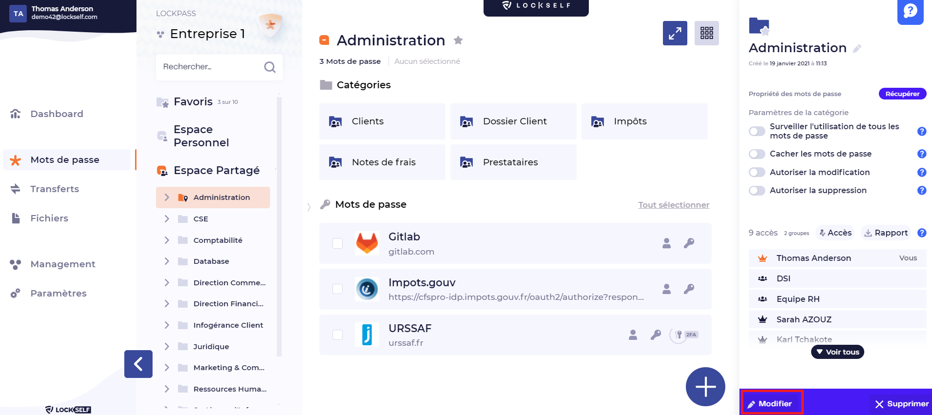 - Etape 1 : Une fois votre politique de mots de passe créée, allez dans l'Espace Partagé de votre choix, et dans le volet d'informations à droite, cliquez sur « Modifier ».