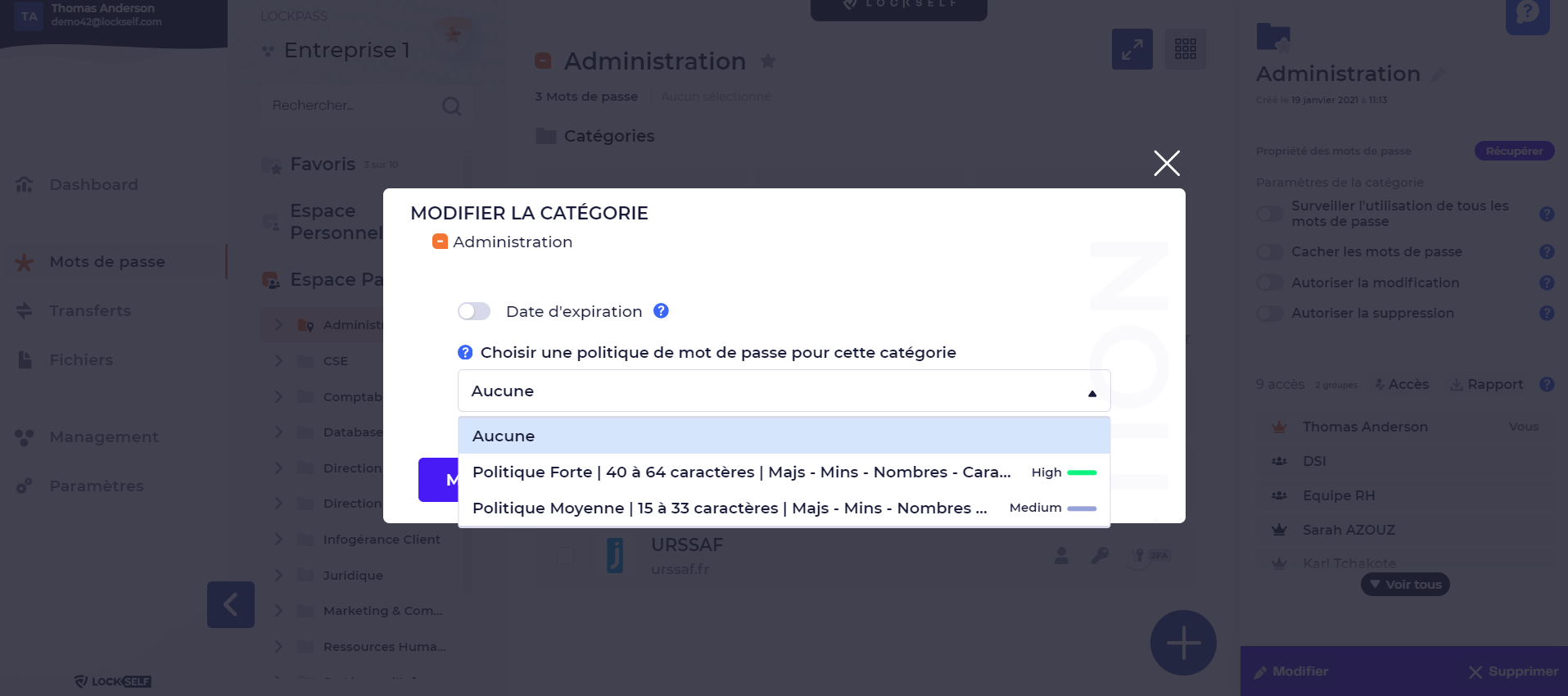 Si vous souhaitez que les mots de passe créés par les utilisateurs dans les Espaces Partagés respectent certains critères, afin de vous assurer de leur robustesse, il est possible d’appliquer des politiques de mots de passe directement aux catégories de mots de passe concernées.