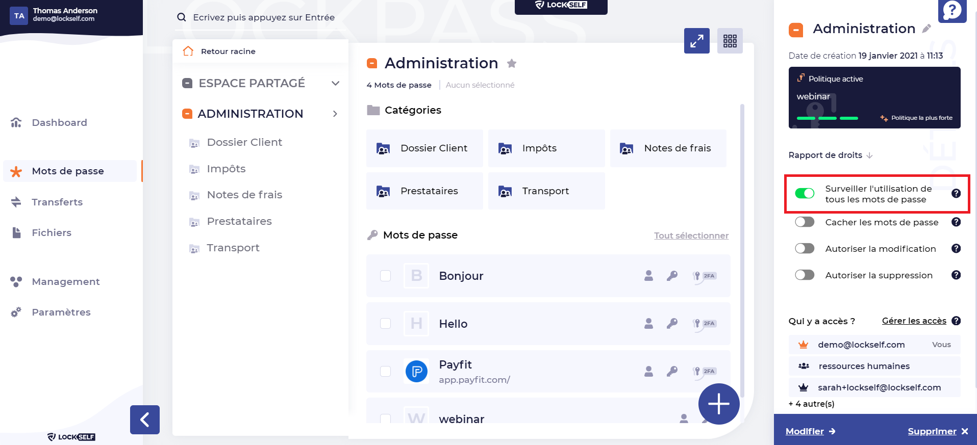 L'utilisateur ayant activé cette option recevra un email de notification à chaque fois qu'un mot de passe de la catégorie sera consulté, modifié et utilisé.