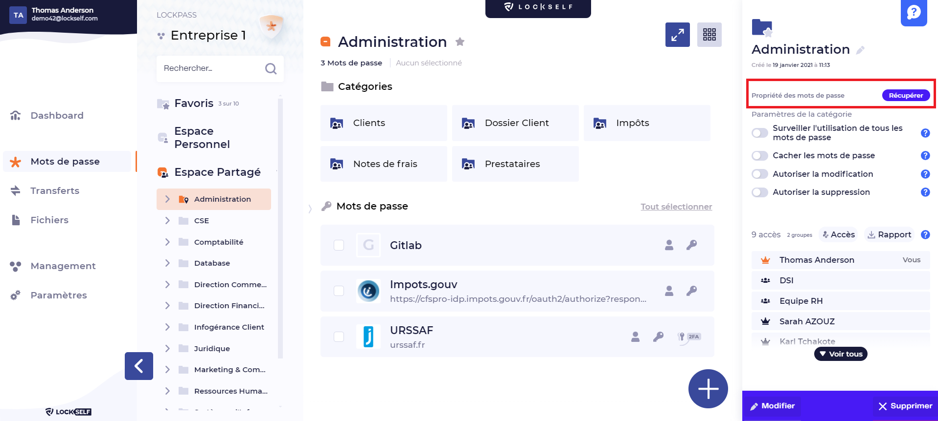 Sur l'Espace Partagé, dans le volet de droite, cliquez sur le bouton « Récupérer la propriété des mots de passe » .